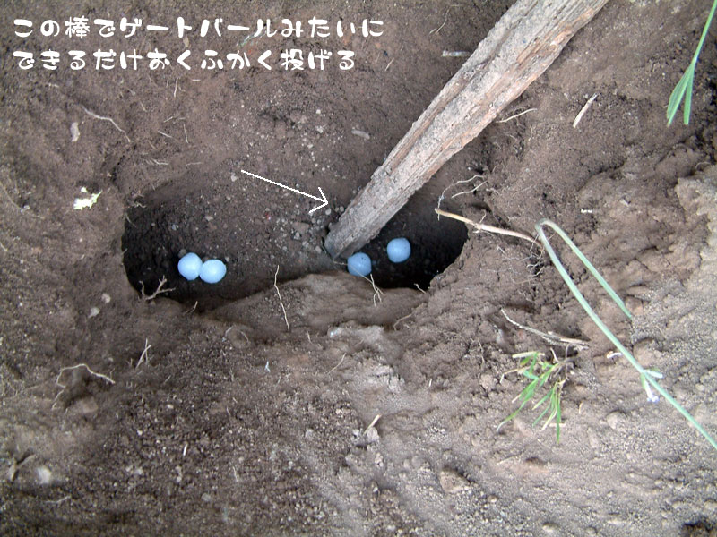 穴にナフタリンを5個程置いて、奥をめがけて力いっぱい棒で転がします。穴には同じサイズの石を詰めて、土を戻します。