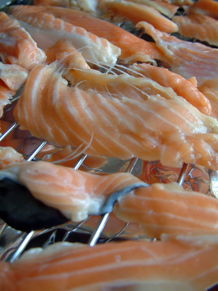アメリカ人は骨の付いたお魚は嫌がるので鮭のこの部分とか、かまとか、頭は取り除いてしまいます。ここは魚の出汁を取るのに売られているのですが(1キロで400円位)、ばあさんにとっては塩焼きで食べるのが最高!腹部にたっぷりついている脂が長時間グリルしている間に細い骨や皮を揚げた様にぱりぱりにしてしまいます!