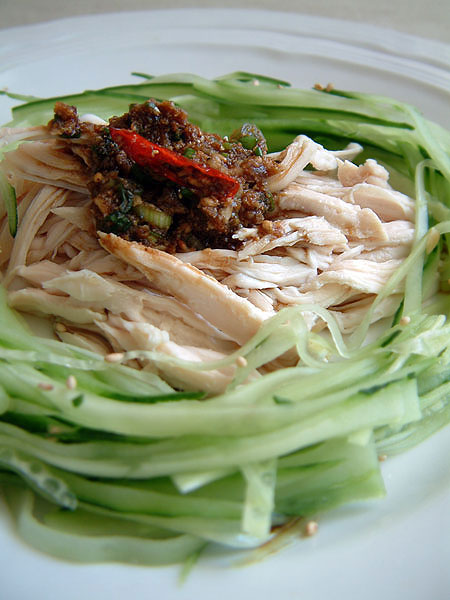 チキンの胸肉(約400グラム)はお酒をかけて蒸し(電子レンジでもOK,少量の水で茹でてもOK)冷えてから手でさいて下さい。