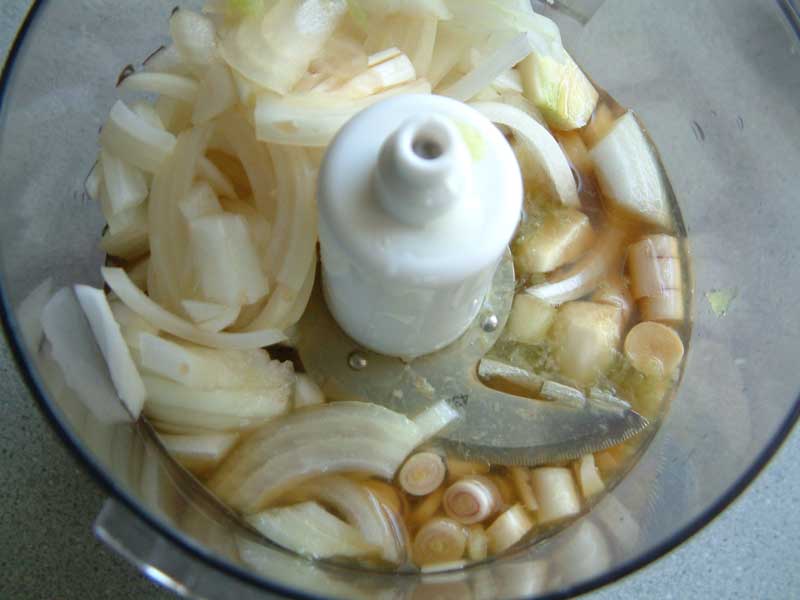というのはね、初めてレモングラスを使ってタイカレーを作った時、本が「レモングラス4本」って書かれてあったんですよ。この写真のレモングラスを全部入れのかしら?と思ったけど、まさかね!でネットで調べたら根に近いところだけを使うって書いてあったのです。それでもどこまで入れたら良いか分からずに、かなり上の方(と言っても根から7cmくらい)も入れてフードプロセサーにかけたのに、硬い粒粒が残ってしまってカレーの舌触りがイマイチでした。それ以来、包丁を入れて凄く硬い部分は入れていません。
