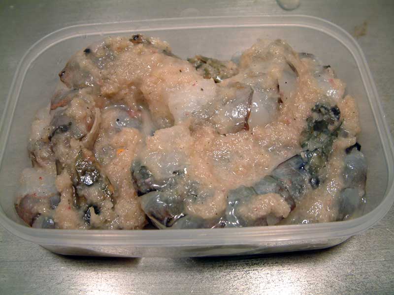 大海老は殻を取って背に切り込みを入れて、一晩浸しておきます。