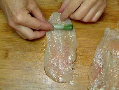 大焼く前にチキンは広げてレモングラスか葱を置いてくるくる巻きます。