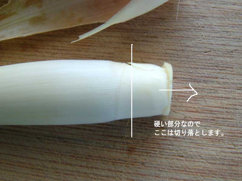 大2、3枚皮をむくと段が見えます。右側の部分は包丁で簡単に切れない程硬いので切り捨ててください。