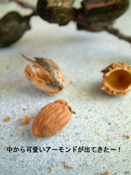 上でカイシャさんがアーモンドの実は最初の頃はジェリーみたいに柔らかいって書いていらっしゃいます。私はそんなアーモンドは未だかつてみた事もありません。レモンのようなすかっとした味のジェリーなんてちょっと想像もつきません。そんなやわらかいものがこんなに硬くなるのが不思議〜!