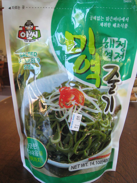 韓国のスーパーに行けば必ず見つかるはずです。 1/3はお塩ですけど、400gで2ドルって安いですね。 わかめの茎ですから硬いです。 韓国人のサイトを見ると、これを炒めて火を通すだけなのですが、それではとても硬過ぎます。 そこで私は塩をしっかり落としたら熱湯で20分煮ています。 少し柔らかくなりますがそれでもこりこりしています。