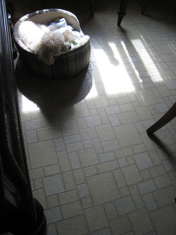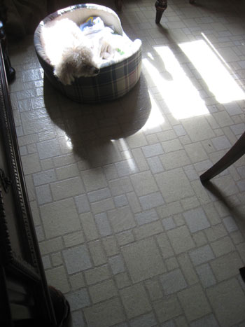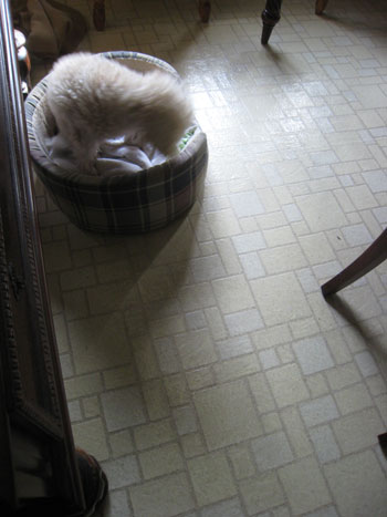 あははは!! ベッドを動かさないと、陰のままの場所でベッドで寝ているか、ベッドから出て自分だけ日向に移動するかのどちらかです。それをみかねてじいさんが動かしているみたい。ここは夏は日光が入らなくなりますから又別の場所に移動します。 そこはカーペットなので自分で移動しながら寝ています。