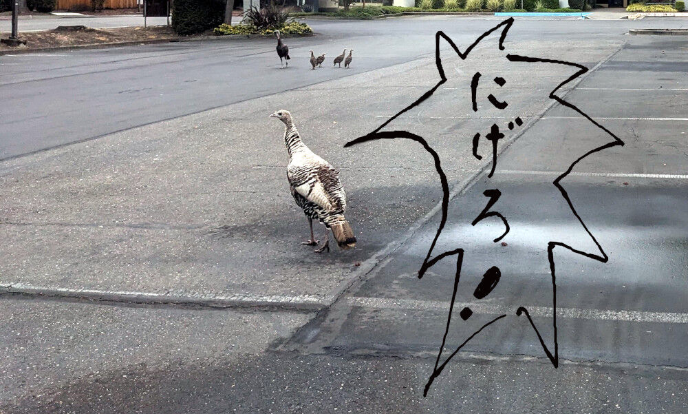 車の方が明らかに大きいのに、この親鳥と同じように私をカッと見据えて微動だにせず、一族全員が道路を渡り切るまで威嚇し続けていました。